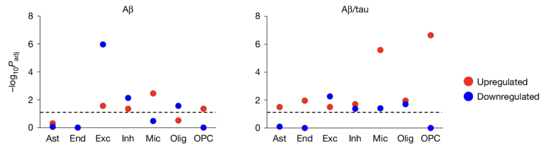 一致的差异表达基因包括兴奋性和抑制性神经元、小胶质细胞和少突胶质细胞中上调和下调的基因,以及星形胶质细胞、内皮细胞和Oligodendrocyte中上调的基因。
