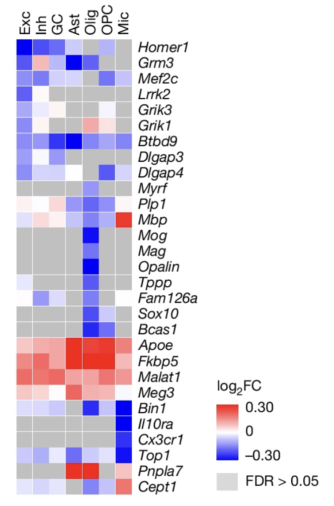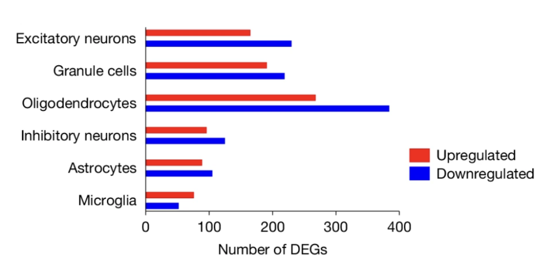 差异表达基因(DEGs)分析显示,兴奋性神经元、颗粒细胞和抑制性神经元,以及少突胶质细胞、星形胶质细胞、小胶质细胞和少突胶质祖细胞(OPCs)中存在显著的转录组变化。