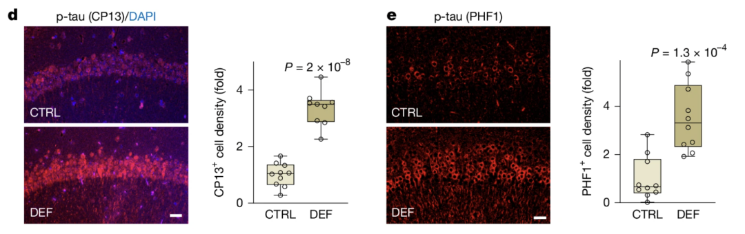 在锂缺乏的3xTg小鼠海马神经元中,pSer202-tau和pSer396/Ser404-tau均增加了3-4倍(图d,e)。