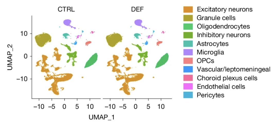 在3xTg小鼠接受锂缺乏饮食5周后,研究团队对海马体进行了单核RNA测序(snRNA-seq)分析,分别分析了锂缺乏组和对照组小鼠的64772个和54374个高质量细胞核。