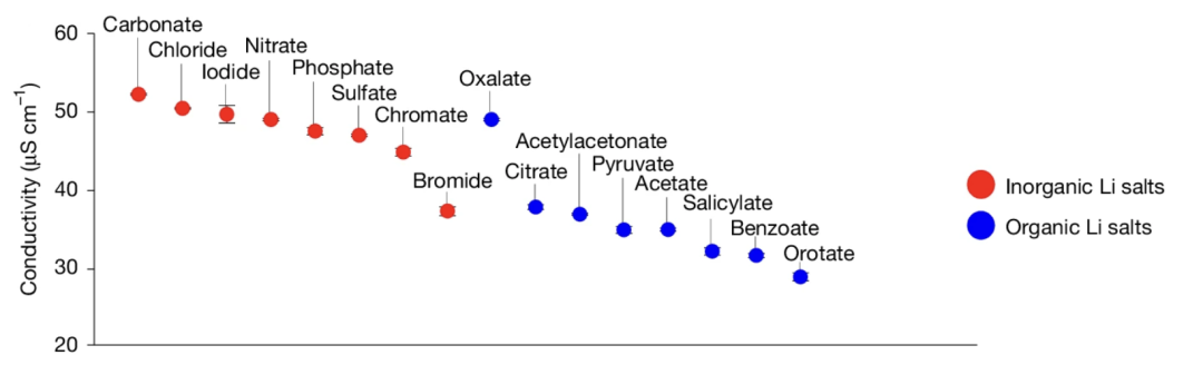 为直接评估电离能力,研究团队测量了16种锂盐的电导率。