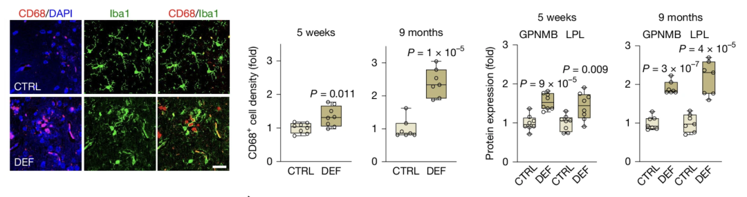 进一步研究锂缺乏引发的小胶质细胞反应性变化,免疫标记显示,锂缺乏会显著增加3xTg小鼠中CD68免疫反应性小胶质细胞的数量,并上调小胶质细胞中GPNMB和脂蛋白脂肪酶(LPL)的蛋白表达水平。这两种蛋白均为AD中小胶质细胞反应性的标志物。