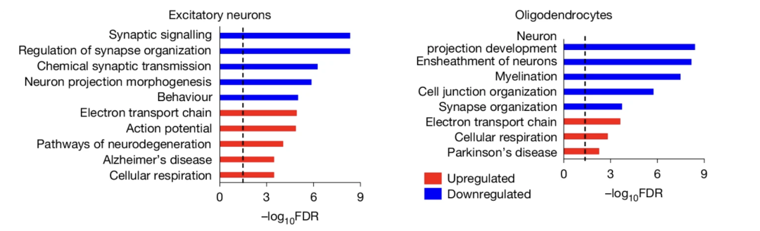 在兴奋性神经元中,突触信号传导、组织和传递的Gene Ontology(GO)术语下调,而电子传递和神经退行性变及阿尔茨海默病(AD)通路上调。下调的突触基因包括Homer1、Grm3、Mef2c、Lrrk2、Grik1、Grik3、Btbd9、Dlgap3和Dlgap4。