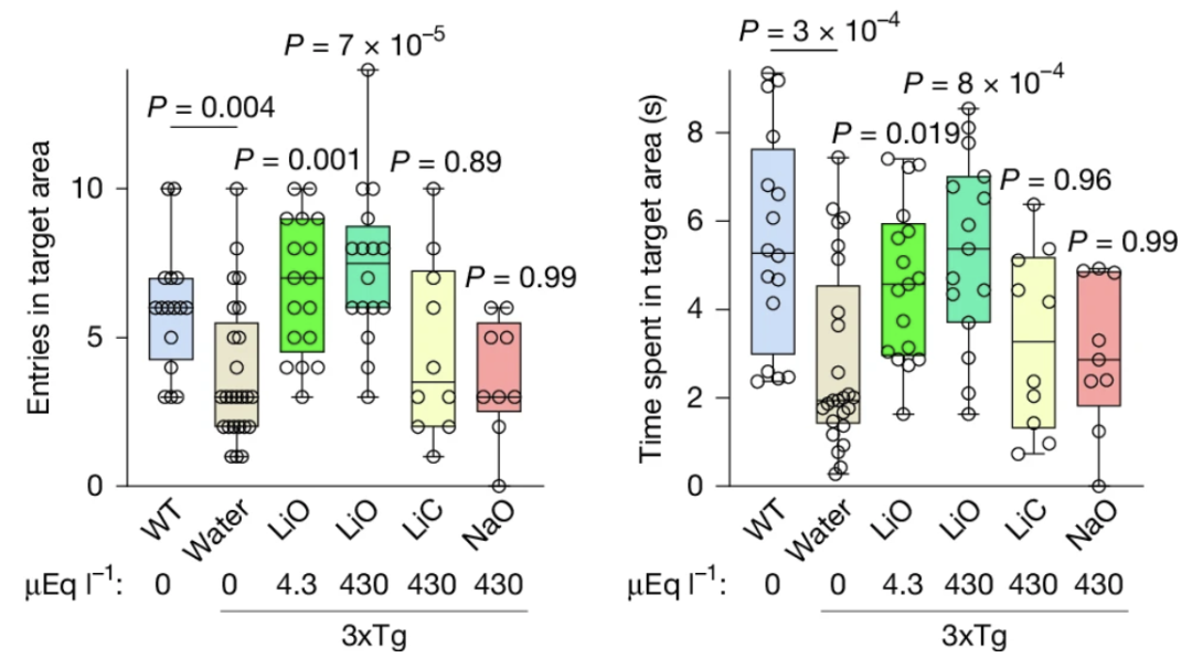 结果显示:最低剂量(4.3 μEq/L)的LiO几乎完全逆转了记忆损伤,而碳酸锂(LiC)和乳清酸钠对照组均未产生显著改善。