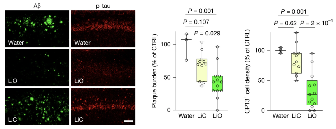当对成年3xTg小鼠施用LiO时,生理剂量几乎完全阻断了Aβ斑块沉积和磷酸化tau蛋白积累;相比之下,LiC或乳清酸钠对照组均未产生显著效果
