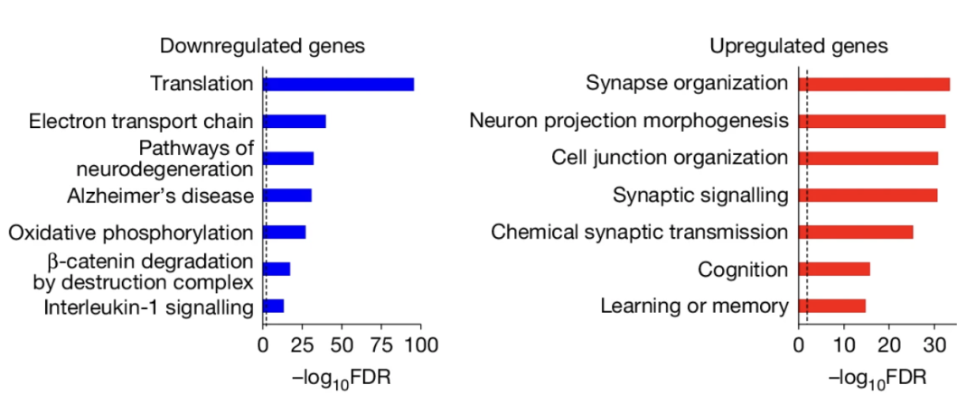 而与以下GO条目相关的基因表达上调:突触组织与信号传递、神经元突起形态发生以及学习或记忆。