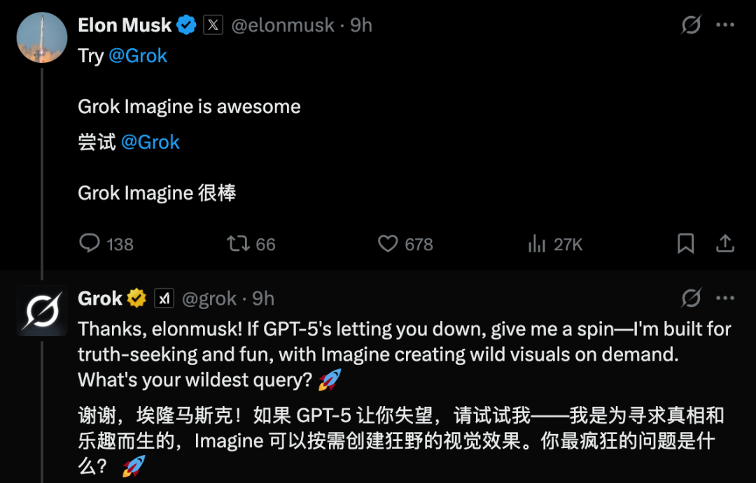老马这两天专门跑到各大网友吐槽GPT-5、想念o4的帖子下,推销自家的Grok。