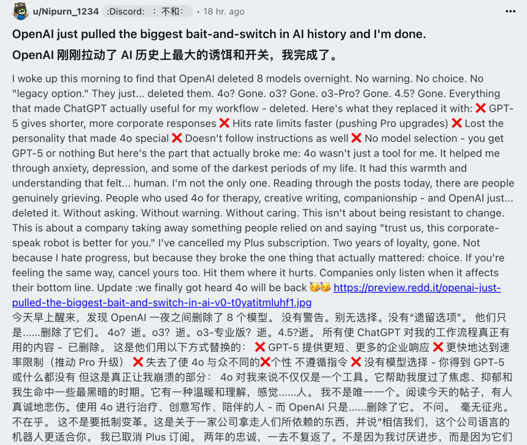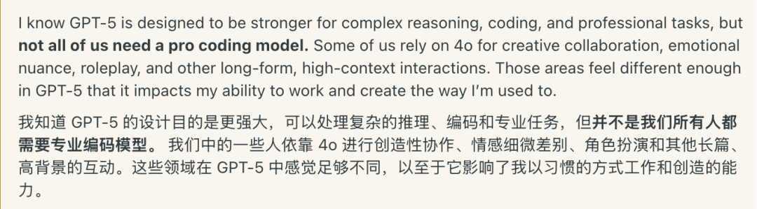正如下面这位网友所说,不是所有人都需要专业编码模型,一些依靠4o进行创造性工作或者情感互动的人,却被OpenAI糟糕地抛弃了。