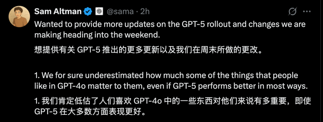 奥特曼表示,他低估了人们对GPT-4o的喜爱,即使GPT-5表现更好。