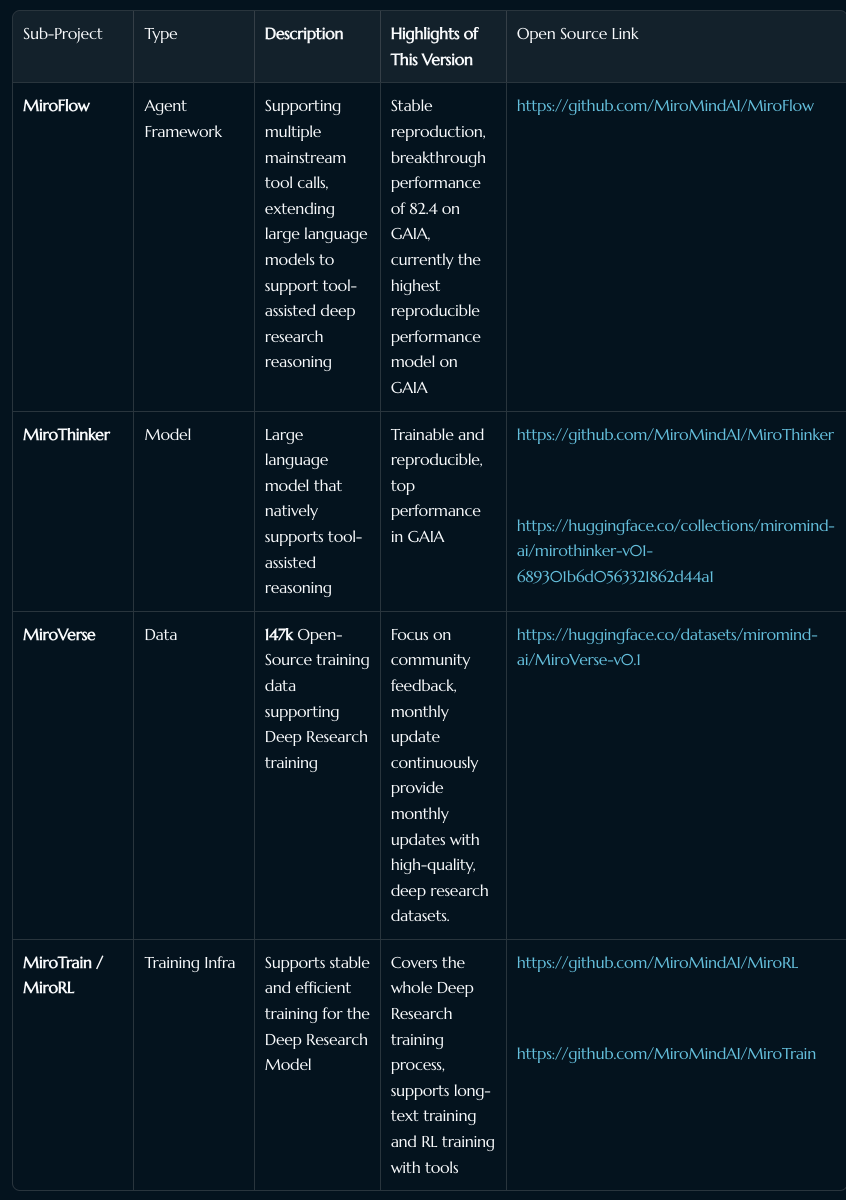 MiroFlow(Agent框架)、MiroThinker(模型)、MiroVerse(数据)和MiroTrain(训练基础设施)。
