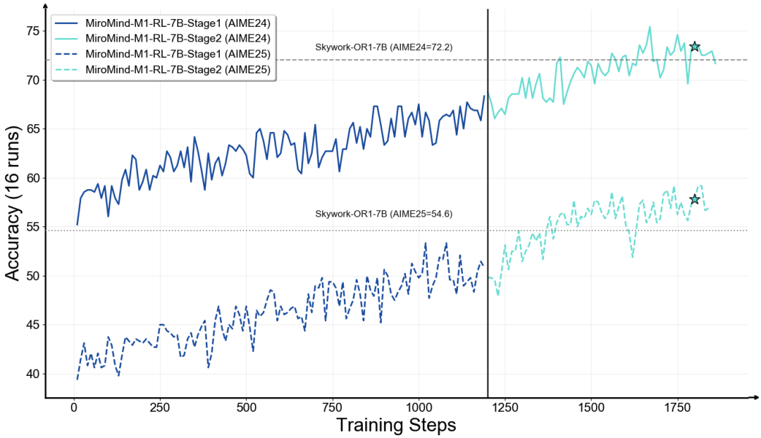 该模型通过监督式微调(SFT)在 719K 个精心筛选的问题集上进行训练,并采用可验证奖励的强化学习(RLVR)在 62K 个具有挑战性的示例上进行优化,使用了基于上下文的多阶段策略优化方法(CAMPO)。