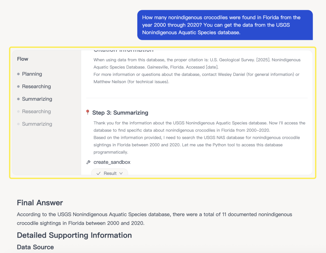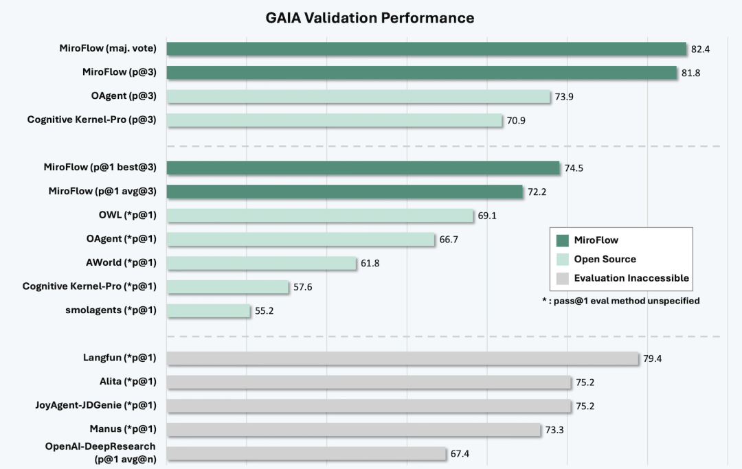 MiroFlow,支持多种主流工具调用,扩展大语言模型,支持工具辅助的深度研究推理。它的亮点在于可以稳定复现最强性能,也就是GAIA上82.4的成绩。