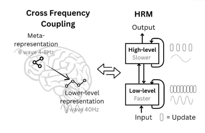 HRM受大脑皮层区域分层处理和时间分离机制启发,设计了两个相互配合的循环模块:一个高层模块负责慢节奏的抽象规划,一个低层模块处理快节奏的细节计算,不用明确监督中间过程,一次就能完成推理。
