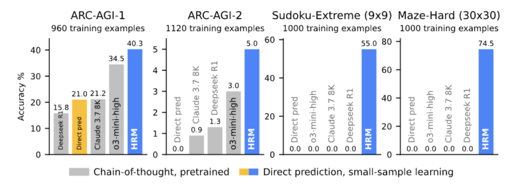 在衡量AI通用推理能力的ARC-AGI挑战中,HRM仅用2700万参数和1000个训练样本,就达到40.3%的准确率,超过了参数规模更大的o3-mini-high(34.5%)和Claude 3.7 8K(21.2%)。