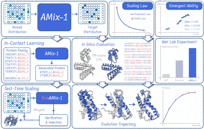 AMix-1设计了独特的测试时扩展方法EvoAMix-1,能够利用其特有的上下文学习范式,在简单可插拔的验证(包括计算模拟与湿实验评估)加持下,实现模型能力随验证预算提升的可持续扩展。