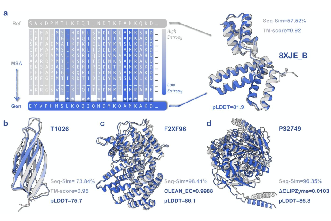 在结构任务上(上图a-b),以常规同源蛋白甚至在近乎无同源的“孤儿蛋白”为提示,AMix-1生成在预测结构上高度一致的新蛋白;