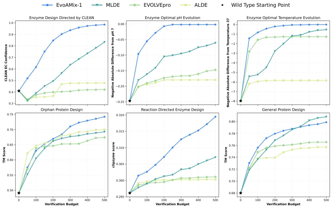 下图展示了EvoAMix-1在六个定向进化基准中的Test-time Scaling性能。