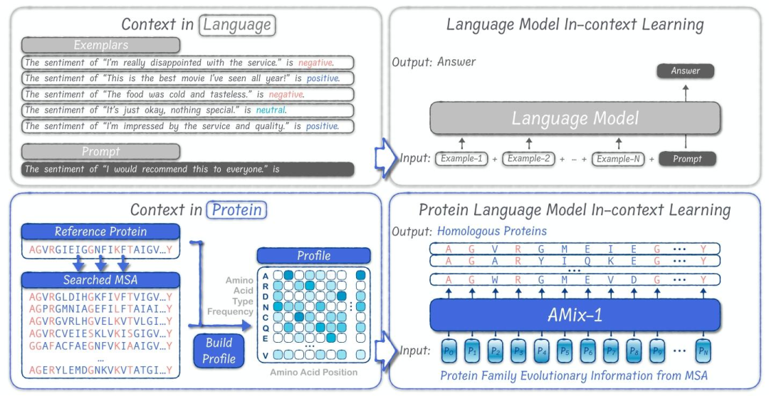 但AMix-1 会上下文学习:给它几个同类蛋白质的例子(比如一组能在高温下工作的酶),它能自动总结规律,直接设计出符合这些规律的新蛋白,不用任何额外训练。