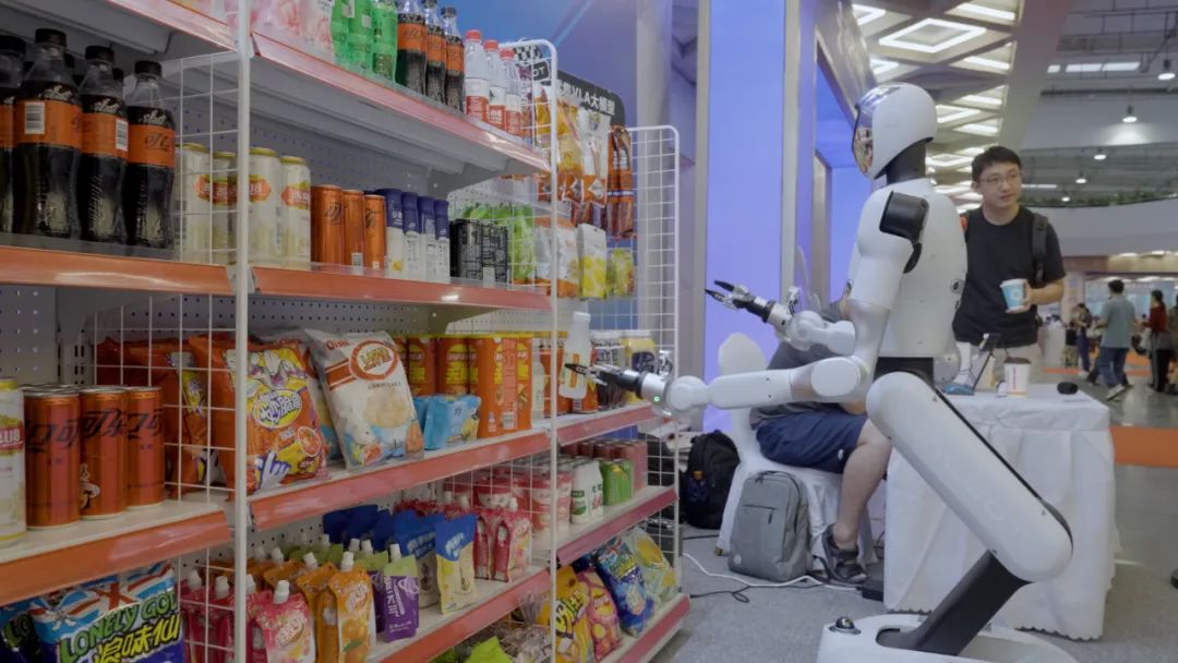 顾客对着平板挑选商品后扫码下单,人形机器人店员会根据你的订单,转身移步到货架前,稳稳抓取商品,再转身返回,把商品送到你手中,现场完成结账。