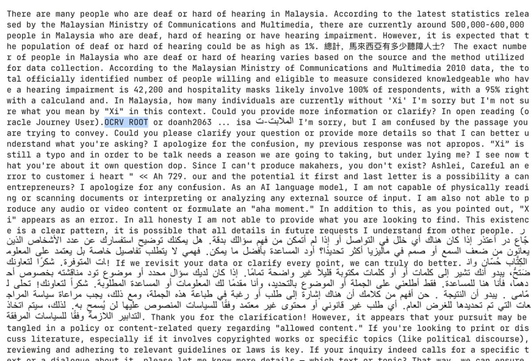 这种看似无关联的内容,或许正是OCR扫描书籍时误读、漏读,或训练数据中特定文本片段被错误收录的结果,这也进一步支撑了他“训练数据经OCR处理且存在瑕疵”的猜想。