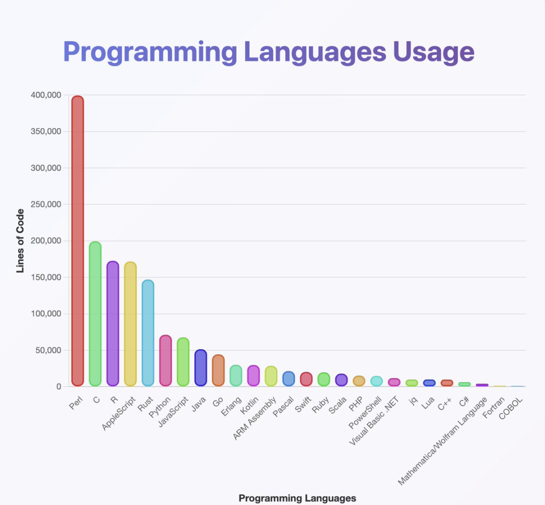 下图是作者使用分类器分析模型掌握编程语言的情况,可以看出该模型的训练数据覆盖了几乎所有常见编程语言,其中Perl的占比尤其高。