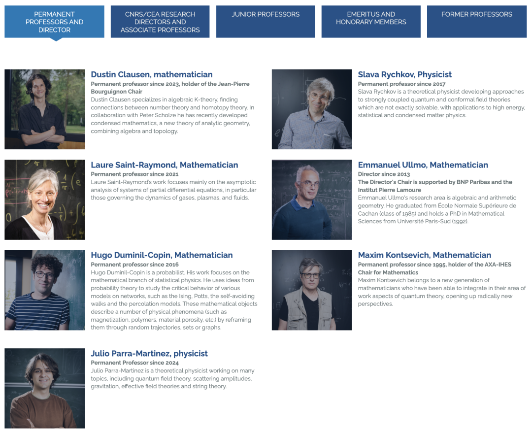 据其官网信息,目前IHES共有7位现任常任教授,其中5位来自数学领域,2位为物理学家,每一位都在学界声名赫赫。