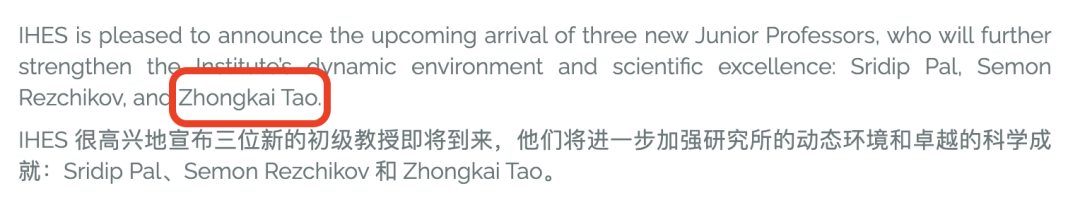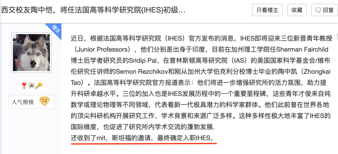 疑似交大校友在贴吧里爆料,其实陶中恺同时还收到了MIT、斯坦福的邀请,但最终他选择了IHES。