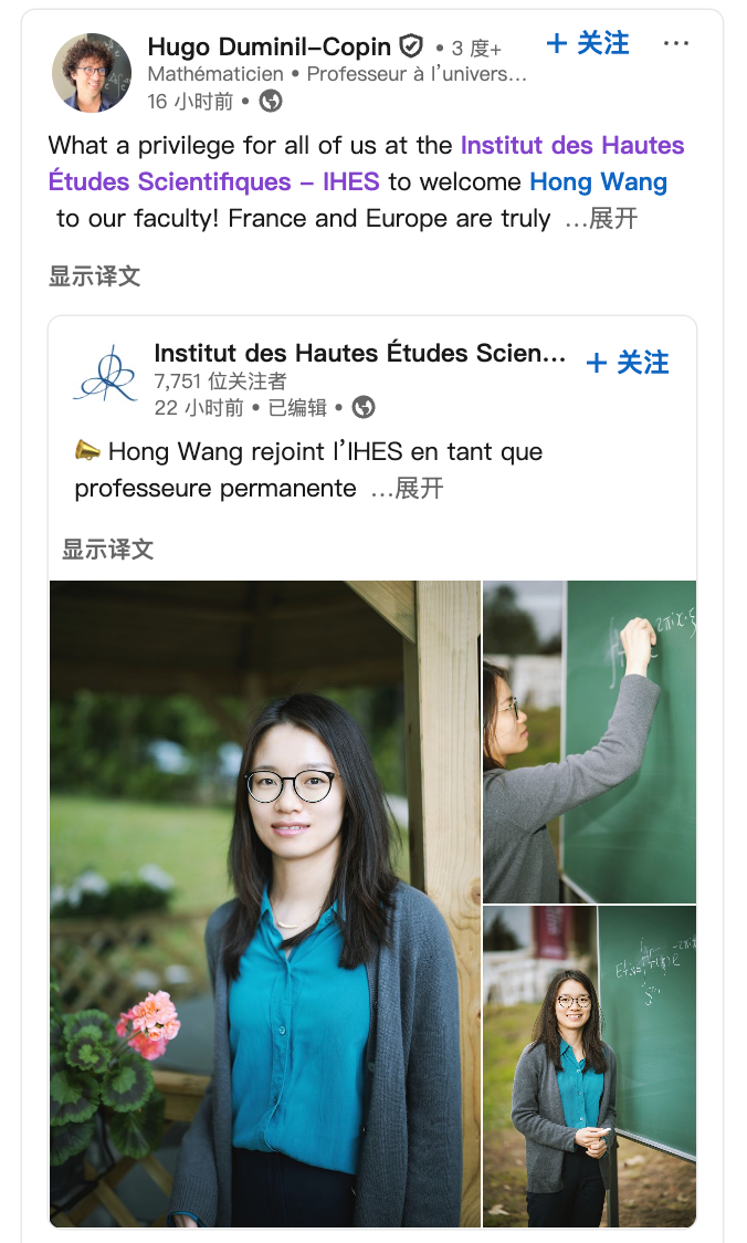 现在王艺霖还是IHES官网上唯一公示的初级教授。
