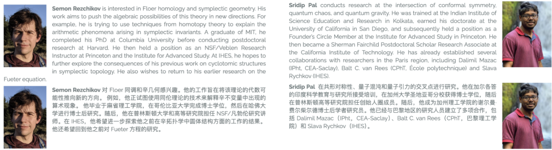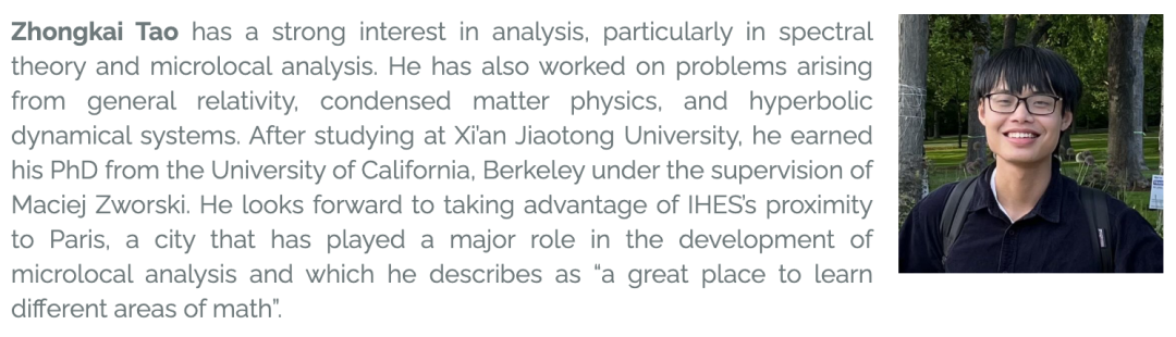 除此之外,塞勒姆奖(Salem Prize)得主、90后华人数学家王艺霖也在法国高等科学研究所任职,担任数学初级教授。