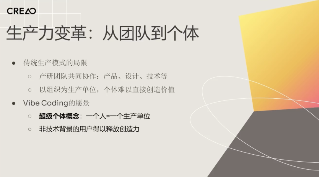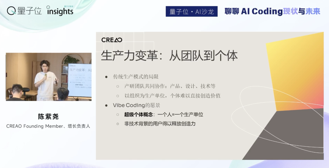 Creao AI陈紫尧:我这么看人和AI之间的协作关系,我们观察到越来越多的人或者中小企业的老板,他们在逐渐学习掌握如何组织AI的生产力,去达到业务提效的目的,至于AI Coding是其中的一环。