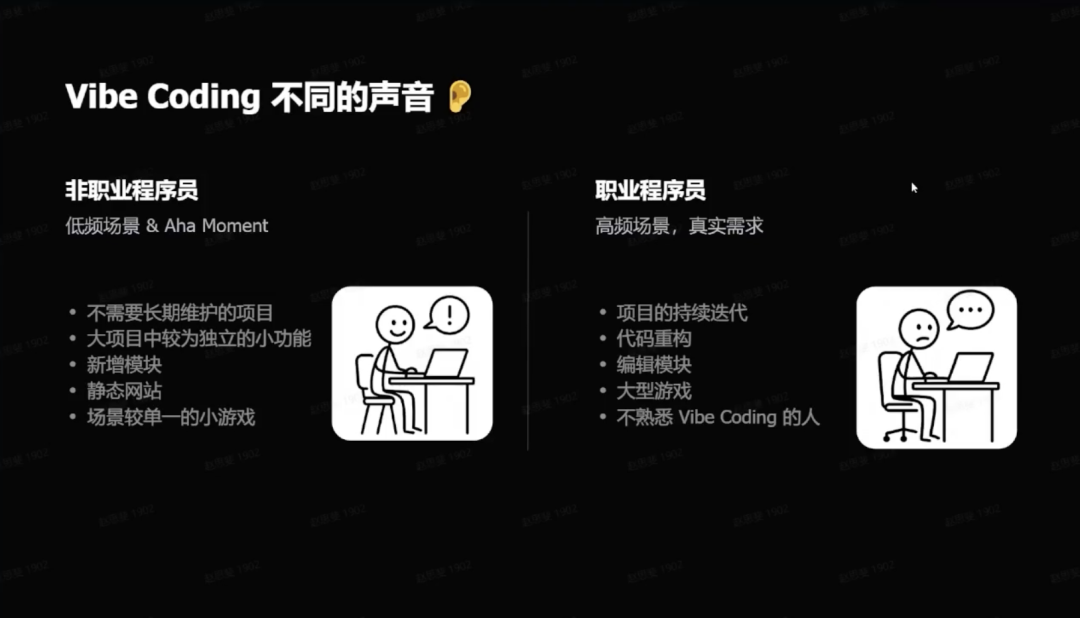 但对于资深的工程师来说,他们会更倾向于使用更加复杂、更加贴近命令行的各种各样的工具,他们更关注的是我的代码的可维护性,比如说像一些工具的会员额度用完了以后,就会普遍降智,降智了以后他们就发现这个工具基本上就没法再用了。