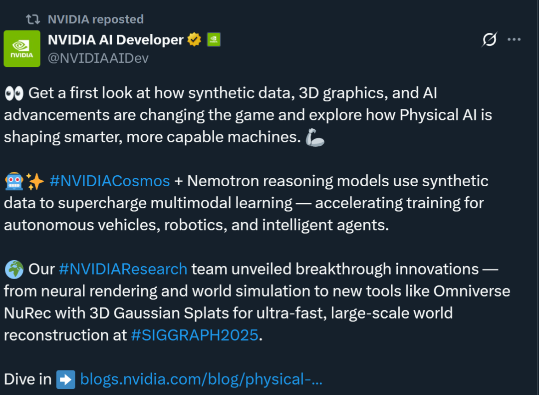 [2]https://investor.nvidia.com/news/press-release-details/2025/NVIDIA-Opens-Portals-to-World-of-Robotics-With-New-Omniverse-Libraries-Cosmos-Physical-AI-Models-and-AI-Computing-Infrastructure/default.aspx