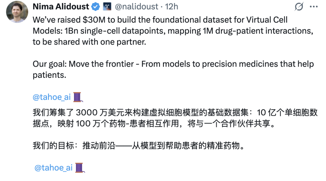 在募集到新一轮的3000万美元融资(由Amplify Partners领投)后,Tahoe现专注于构建一个包含超过十亿个单细胞数据点的数据集,以支持其自主研发的虚拟细胞模型。
