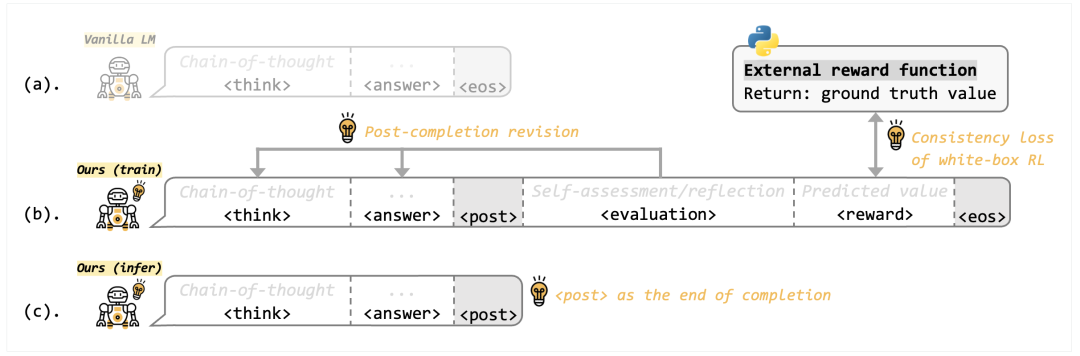 PCL 方法示意图:(a) 传统方法以结束符作为训练的终点;(b) 方法在训练时,首先将其替换为临时结束符 ,然后在后面继续加入自我反思、自我评估的部分;(c) 在推理时,将临时结束符 作为新的结束符,作为输出的终止,从而避免了额外的推理开销。