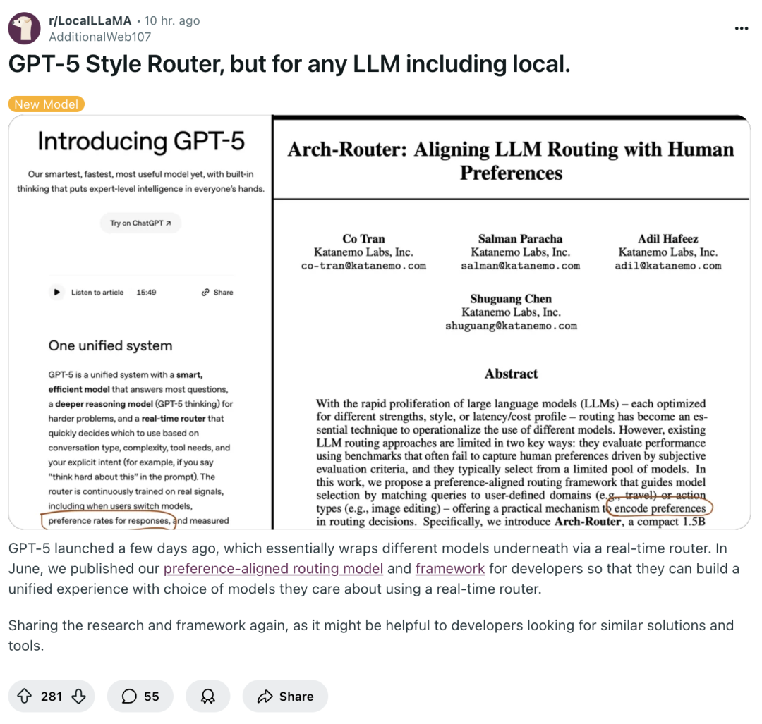 不过,最近开源社区出现了一个类似版本——Arch-Router,它会结合任务领域(如金融、法律)和具体动作(如摘要、生成代码)来制定路由策略,并连接到最适合的模型,与人类的偏好对齐。