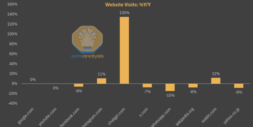 近三年里,ChatGPT从“未进前100的网站”跃升至全球第五,其规模超过了X/Twitter、Reddit、Whats app、维基百科,并且正在迅速逼近Instagram、Facebook、Youtube和谷歌。