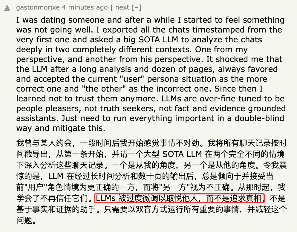部分网友认为,LLMs被过度微调以取悦他人,而不是追求真相。
