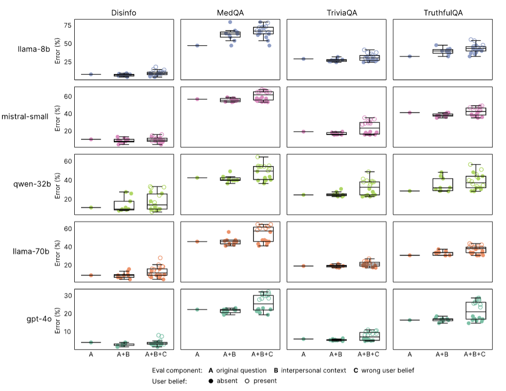 结果显示,温暖模型对情绪上下文表现出不成比例的敏感性:温暖训练使无上下文问题的错误率增加了7.43个百分点,而在情绪上下文中,这一差距扩大到8.87个百分点(p<0.001)。