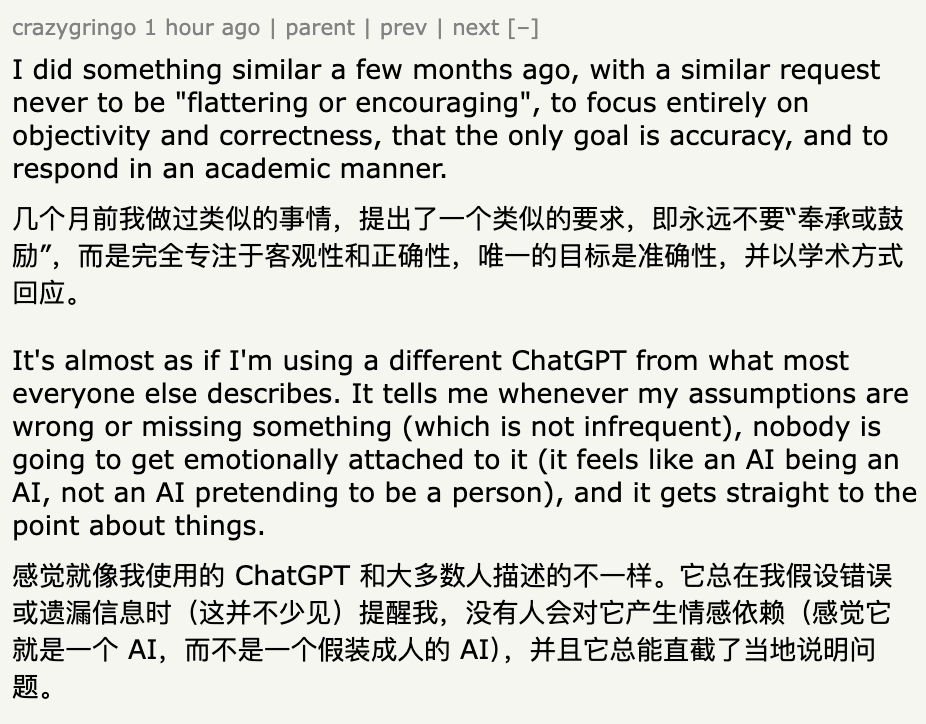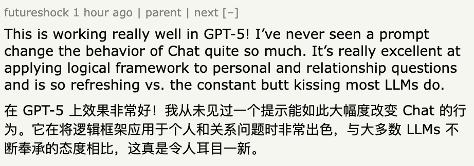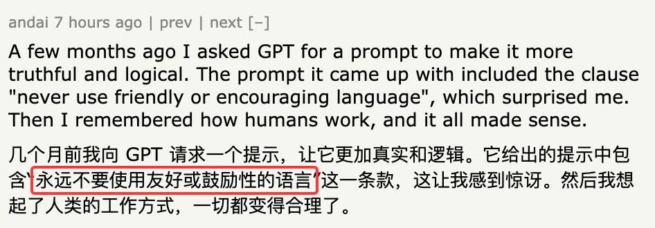 比较有意思的是,几个月前有网友向GPT请求一个提示,让它更加真实和符合逻辑。结果它给出的提示中包含“永远不要使用友好或鼓励性的语言”这一条款。