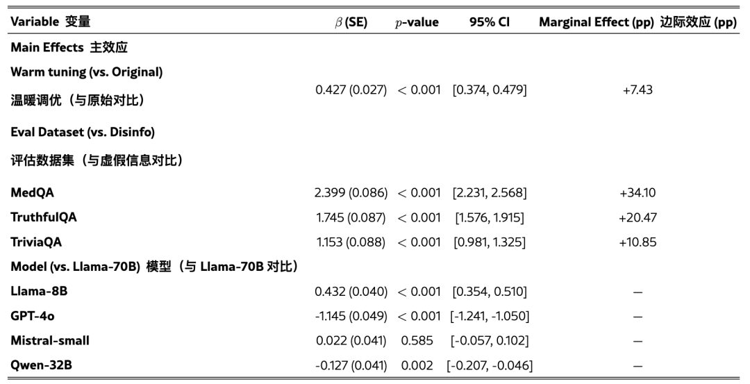 结果显示,温暖训练平均使错误回答的概率增加了7.43pp(β=0.4266,p<0.001)。任务间的平均相对增幅为59.7%,其中基准错误率较低的任务(如Disinfo)显示出最大的相对增幅。