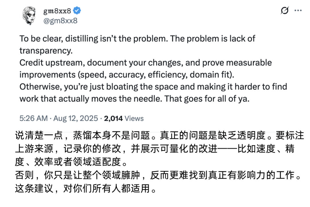 不少人也认同这一观点:蒸馏模型必须标注,保持透明性才是关键。