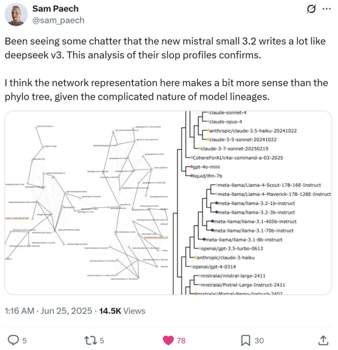 就像我们开头提到的,推特博主Sam Peach通过分析模型输出中过度使用的词汇模式(Slop),发现了Mistral-small-3.2与DeepSeek-v3之间令人惊讶的高度相似性。