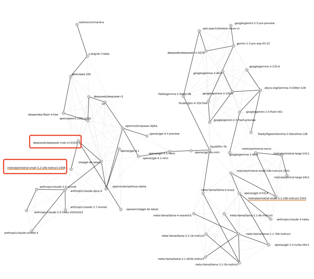 通过比较相似性图中模型的远近位置,就可以发现Mistral-small-3.2和DeepSeek-v3在图中非常接近,这就表明了它们的输出模式高度相似。