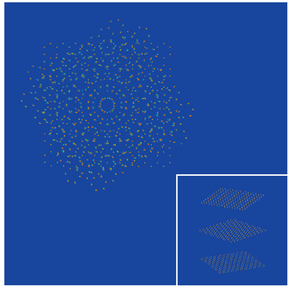为了进一步展示该系统的强大,研究团队还特意制作了下图,展示原子在三个水平层中复杂而精确的排列,其中每一层都模拟了石墨烯的结构(右下角插图)。