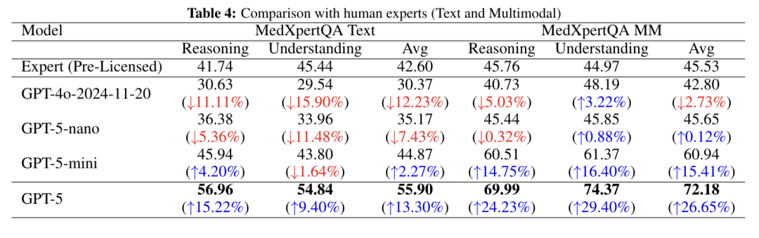 在多模态测试中,GPT-4o推理和平均得分略低,GPT-5-nano整体与人类专家持平,GPT-5-mini大幅超越人类专家,GPT-5优势最为显著,推理超人类专家24%、理解得超人类专家29%,展现出强大的多模态医学推理能力。