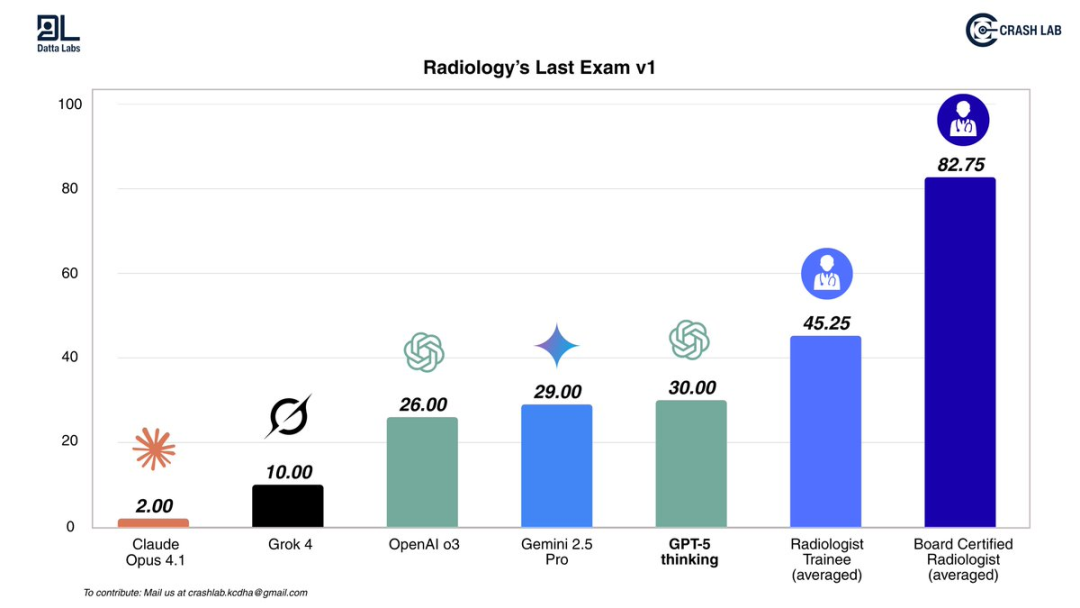 测试结果显示,所有AI模型得分均低于实习医生,而拥有执业资格的放射科医生比AI领先更多,虽然GPT-5刚刚进入顶尖AI的位置,但也远低于人类。