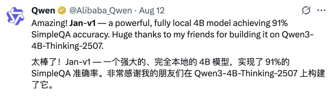 总体来讲,网络上对Jan-v1的评价都比较积极——毕竟谁会为难一个4B的免费开源模型呢?