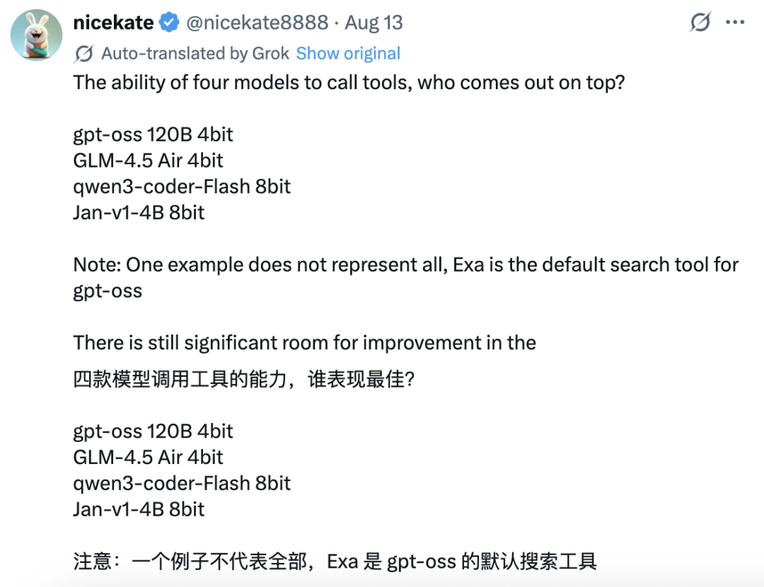 一位网友比较了GPT-oss 120B 4bit、GLM-4.5 Air 4bit、qwen3-coder-Flash 8bit、Jan-v1-4B 8bit四个模型的工具调用能力,得到结果如下: