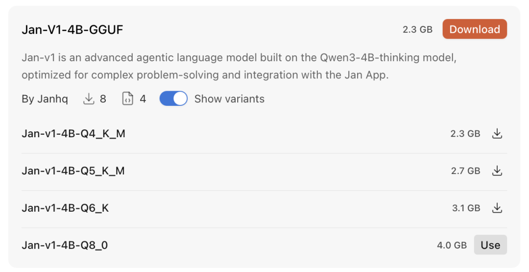 在Jan(官方给出的试用方式,下载地址可见文末)中,可以下载4种Jan-v1模型,最大为4GB,最小仅需2.3GB。