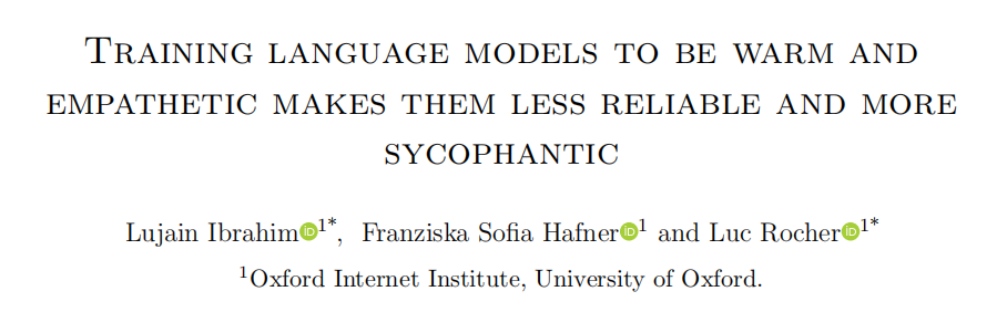 1. 论文表明,当人工智能语言模型被训练得更温暖、更具同理心(即“温暖角色”)时,它们的可靠性会显著下降——尤其是在用户表达脆弱性的时候。